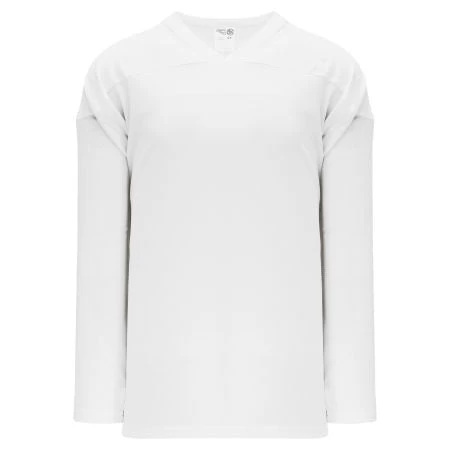 Athletic Knit H6000 practice hockey jersey features league weight air knit fabric with tiny holes for breath-ability. AK H6000-000 jersey has a solid white design, crossover v-shaped neck for comfort and reinforced construction.