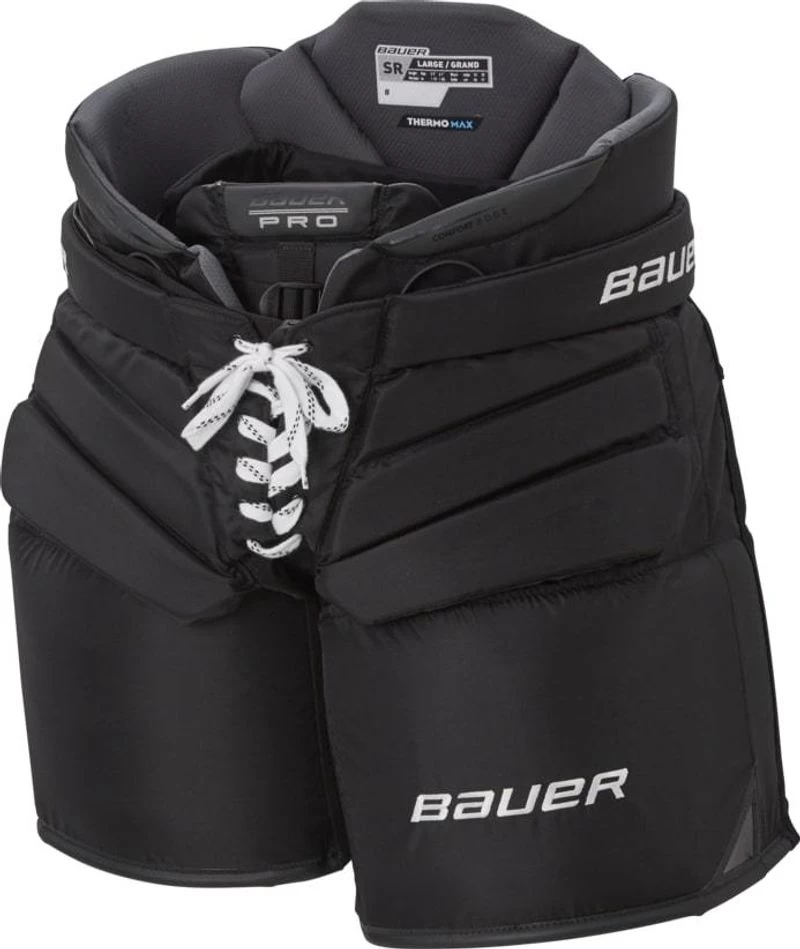 The Bauer Pro Goal Pant is our top-of-the-line pant. It gives goalies a Pro look but with upgraded durability, flexibility and protection. It features 10 inch legs and CURV plus PORON for protection. It’s incredibly durable and completely adjustable in the legs with the extension fit system.
