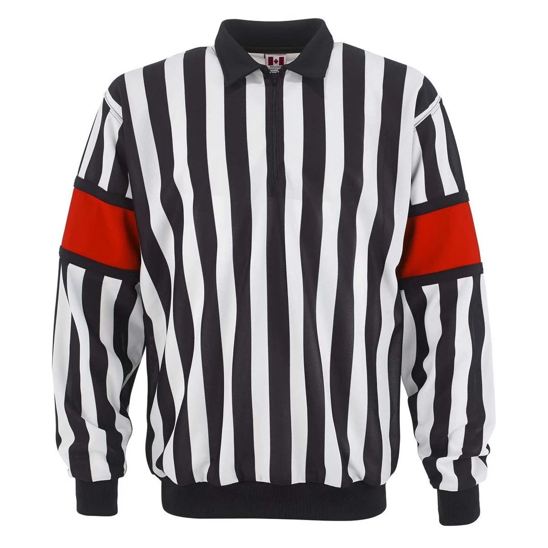The CCM Pro 150 Referee Jersey has red arm bands sewed. This jersey is ideal for elite referees who want a durable, ventilated, and flexible official jersey.