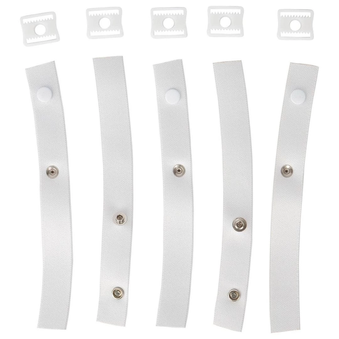 Five elastic straps, five plastic slide through snaps. Fits most goalie masks.