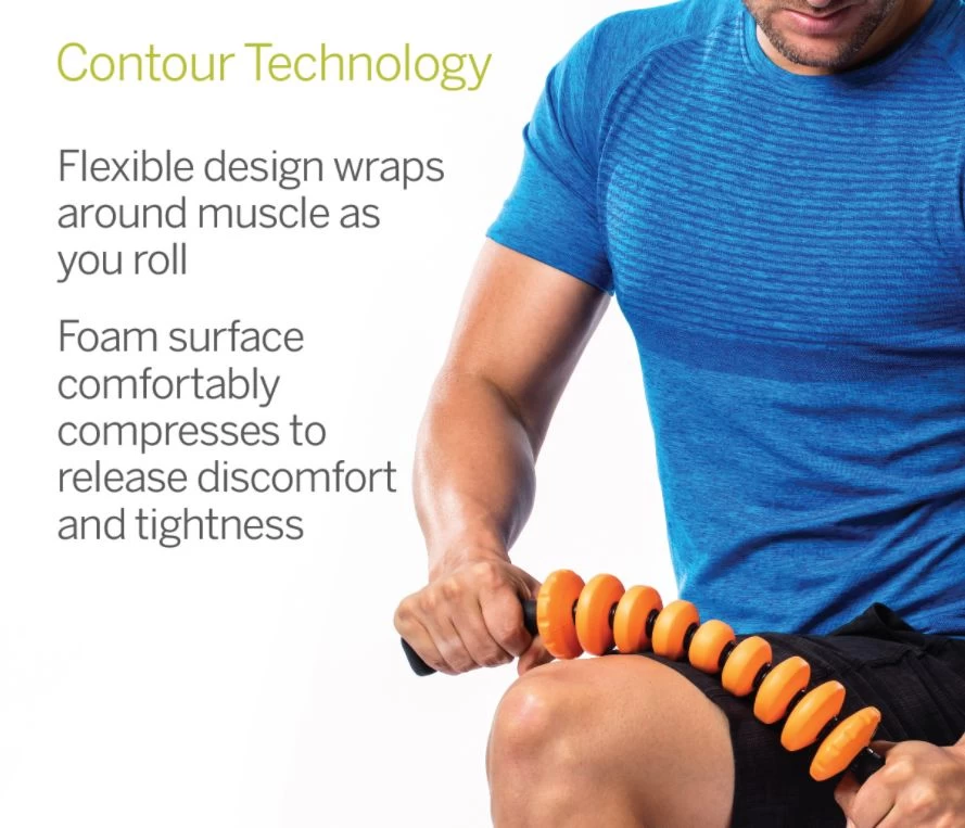 The STK Contour is an innovative handheld foam roller featuring a flexible hourglass design and comfortable foam surface. The unique construction is designed to wrap around and compress muscles while rolling to relieve muscle soreness and speed up recovery. Foam spindles individually roll across muscles to increase circulation and improve muscle mobility. The STK Contour massage stick can be used while seated or standing to target both lower and upper body muscles such as the calf hamstring quadriceps hips and back. All TriggerPoint handheld massage rollers provide portable on-the-go relief from muscular aches and pains.